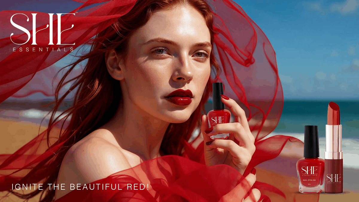 The brand message celebrates red as a symbol of confidence and expression, encouraging bold beauty that exists in harmony with nature and emotion.
